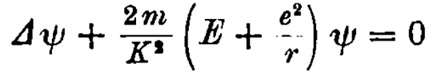 kde m je hmotnost elektronu, E je vazbová energie elektronu v Coulombickém potenciálu a Ψ popisovala vlnovou funkci elektronu. Z dalšího plynulo, že K je redukovaná Planckova konstanta. Schrȍdinger ukázal, že tato rovnice má řešení jen pro diskrétní záporné hodnoty E, jež přesně odpovídaly hodnotám Bohrova modelu.