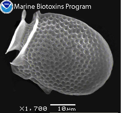 Dinophysis acuminata produkuje jeden z biotoxinů - kyselinu okadaikovou. Ta se akumuluje v mÄ›kkýšÃch, korýšÃch,... (Foto: Steve Morton)
